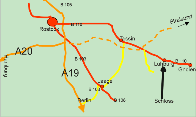 Anreise mit dem Zug: von Rostock aus mit dem Zug nach Tessin, von dort aus weiter mit dem Bus nach Lühburg immer der B110 entlang am Ortsende geht dann rechts eine Stichstraße zum Schloss. Mit dem Bus: vom ZOB in Rostock direkt mit dem Bus Richtung Demmin, der hält in Lühburg, fährt aber nicht so oft. Mit dem Auto oder Trampen: Ist auf jeder Landkarte rauszufinden! Also dann, bis zu unserem Wiedersehen im hohen Norden. |