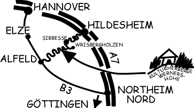 Bis Hildesheim und weiter nach Alfeld. Von dort aus mit dem Bus 2513 weiter bis Wrisbergholzen. Genauere Auskunft auch in der Kulturherberge unter Fon 05056 - 8787. Sammelabholungen auch über diese Nummer Auf Strasse Über die Verbindungsstraße zwischen Hildesheim und Alfeld. Zwischen Sibbesse und Langenholzen führt sie kurvenreich über den Berg. Am höchsten Punkt befindet sich eine Notrufsäule. Gegenüber biegt ein Waldweg ab, der euch direkt zur Kulturherberge führt. |