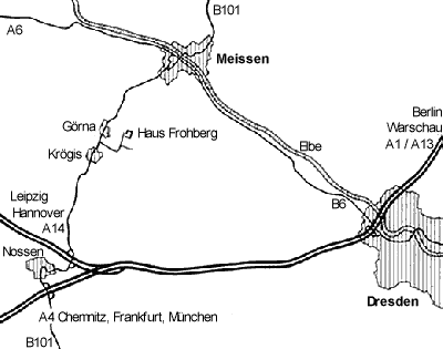 Also alles rund 30 km westlich von Dresden A14: Abfahrt Nossen Ost 8km Richtung Meissen auf B101 B101 zwischen Krögis und Görna rechts abbiegen nach Schönnewitz 500m nach Schönnewitz grosser Parkplatz am Haus mit Bahn und Bus : Dresden Hbf oder Dresden Neustadt S-Bahn Meissen Bahnhof Bus 412 oder 422 bis Görna ca. 400m zu Fuss 10 km mit Taxi von Meissen |