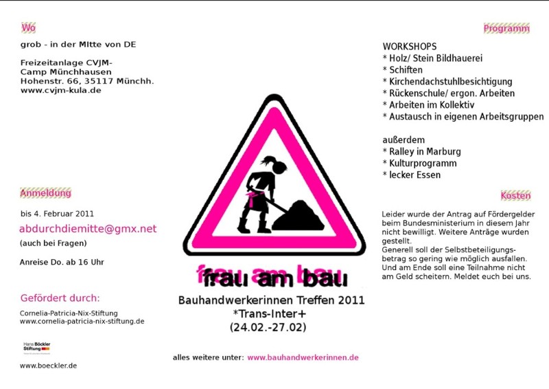 Hans - Böckler - Stiftung Cornelia - Patricia - Nix - Stiftung Landkreises Marburg - Biedenkopf, Frauenbüro Dank ihrer freundlichen Unterstützung ist es uns möglich, den Selbstbeteiligungsbetrag wieder sehr gering zu halten. Wir rechnen mit einem Preis so um die 60-80 Euro. Spielräume nach Selbsteinschätzung sind drin. Der endgültige Preis wird sich wie jedes Jahr auf dem Treffen ergeben. Fahrtkosten wollen wir soweit möglich bezuschussen. Je eher ihr euch anmeldet, desto mehr Zeit gibt es Mitfahrgelegenheiten zu organisieren. Frauen, die gerne kommen möchten, aber knapp bei Kasse sind, sollen deswegen auf keinen Fall fernbleiben, meldet euch bei uns. |