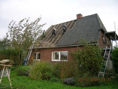 Im Norderheverkoog wird ein Dach neu eingedeckt, wird der Dachstuhl