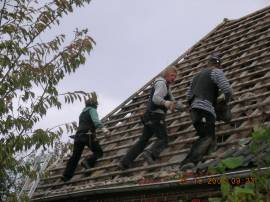 Lattung ist entfernt. Ich habe die Nachricht erhalten, daß weder Sturm und in den nächsten Stunden auch kein Regen zu erwarten ist. Die Voraussagen des DWD für den nächsten Tag sind aber uneindeutig. Zumindest die Unterspannbahn (Wind und Regenschutz) und die Konterlattung müssen bis zum Abend angebracht sein. Da wir gut in der Zeit sind, latten wir die komplette Dachseite auch noch neu ein (nicht nur Notlatten um bis nach oben zu gelangen). |
